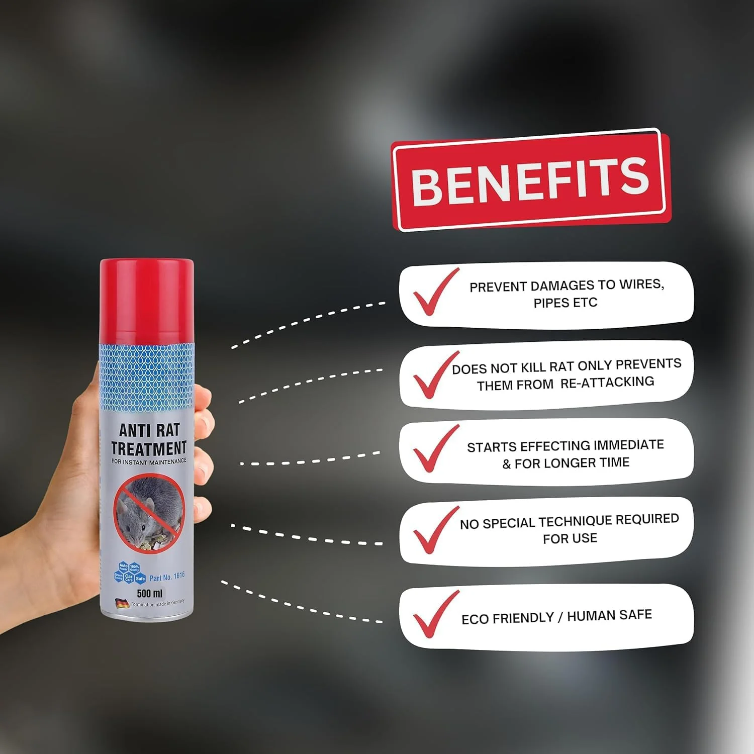 Anti Rat Treatment Spray is an easy to use, natural essential oil based product. When sprayed it prevents rodents from nesting, traveling and congregating in unwanted areas. Ideal for Cars, Trucks, Buses, Schools, Homes, Offices, Warehouses, Garages etc. This product does not kill rodents but just drives them away. Being essential oil based, this product is harmless to humans and has a pleasant mint smell.