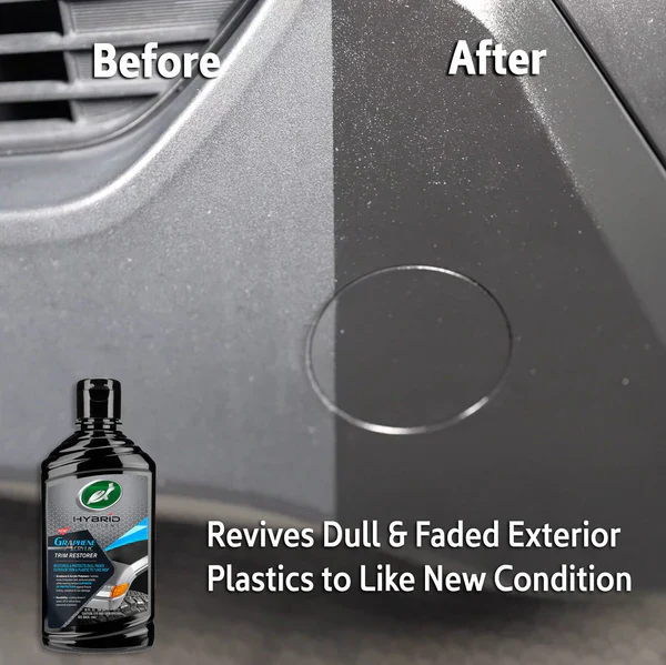 - Graphene & Acrylic Polymers restore, shine, and blacken dull textured plastic